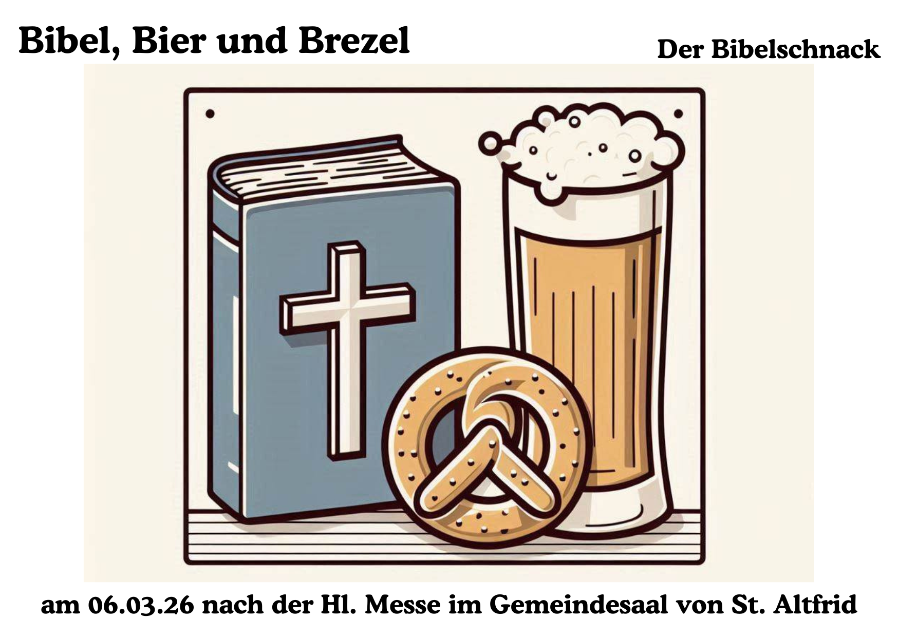Herzliche Einladung zu einem Bibelformat der anderen Art: In gemütlicher Atmosphäre wertschätzend über die Bibel sprechen, mit einer Brezel und einem Bier – in der Fastenzeit sind natürlich auch alkoholfreies Bier und andere alkoholfreie Getränke vorhanden. Am Freitag, den 06.03.2026 nach dem Gottesdienst im Gemeindesaal von St. Altfrid!