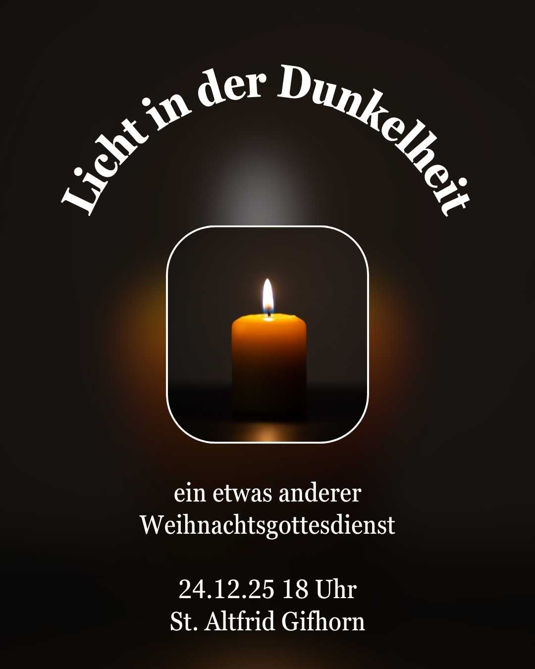 „Ein Licht in der Dunkelheit“ – so lautet das Motto des diesjährigen anderen Gottesdienstes an Heilig Abend in der St. Altfrid-Kirche. Ein Gottesdienst voller Ruhe, Licht und Besinnung, um diesen besonderen Abend im Jahr mal abseits all des Trubels und der Hektik zu genießen und sich zu sammeln für die Ankunft des Kindes in der Krippe. Los geht’s um 18 Uhr. Herzliche Einladung!