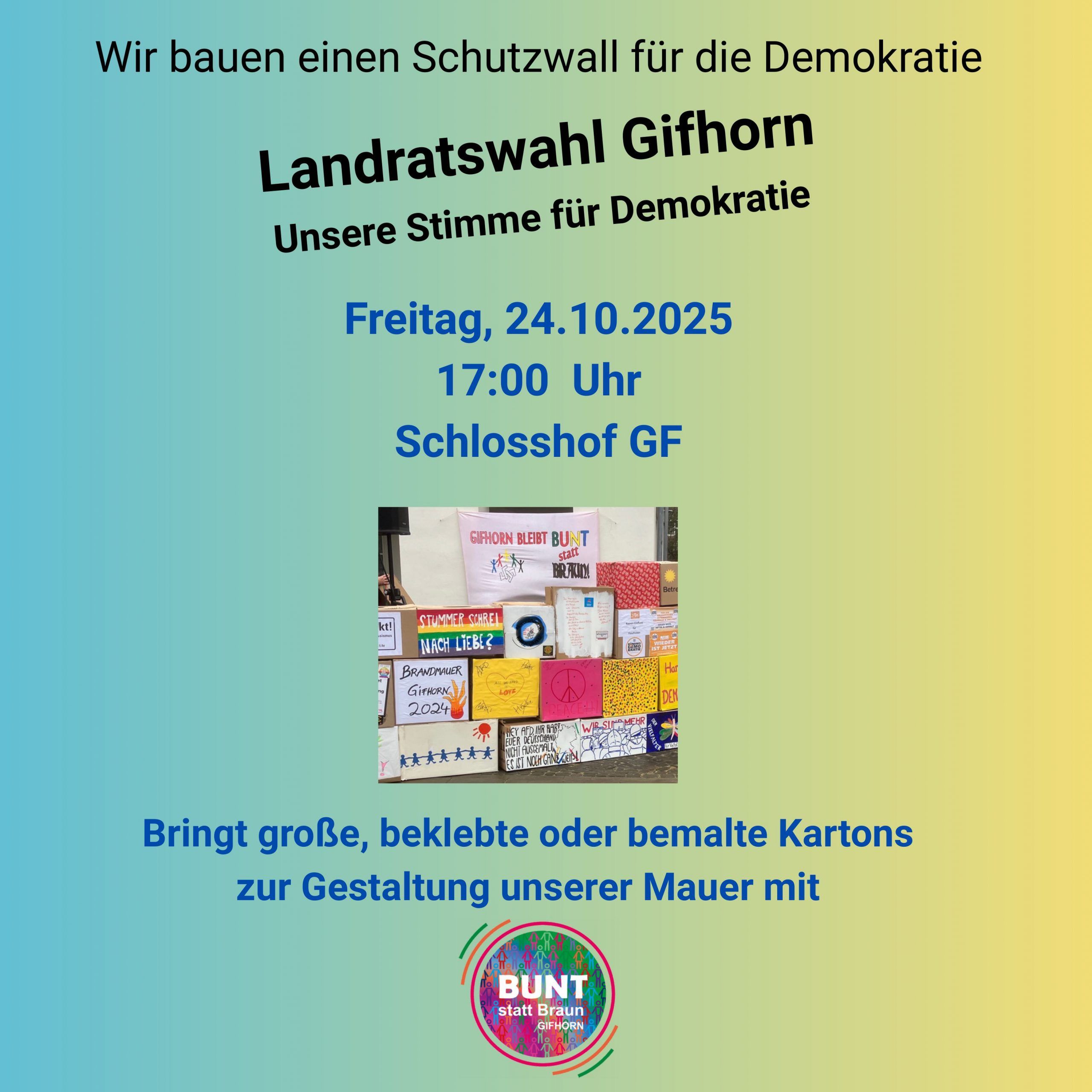Im Blick auf die Landratswahlen ist es an der Zeit ein deutliches Zeichen für die Demokratie im Landkreis Gifhorn zu setzen. Daher findet heute um 17 Uhr im Schlosshof Gifhorn eine Kundgebung für Demokratie statt! Kommen Sie dazu und bauen mit an einem starken Bild für die Demokratie.