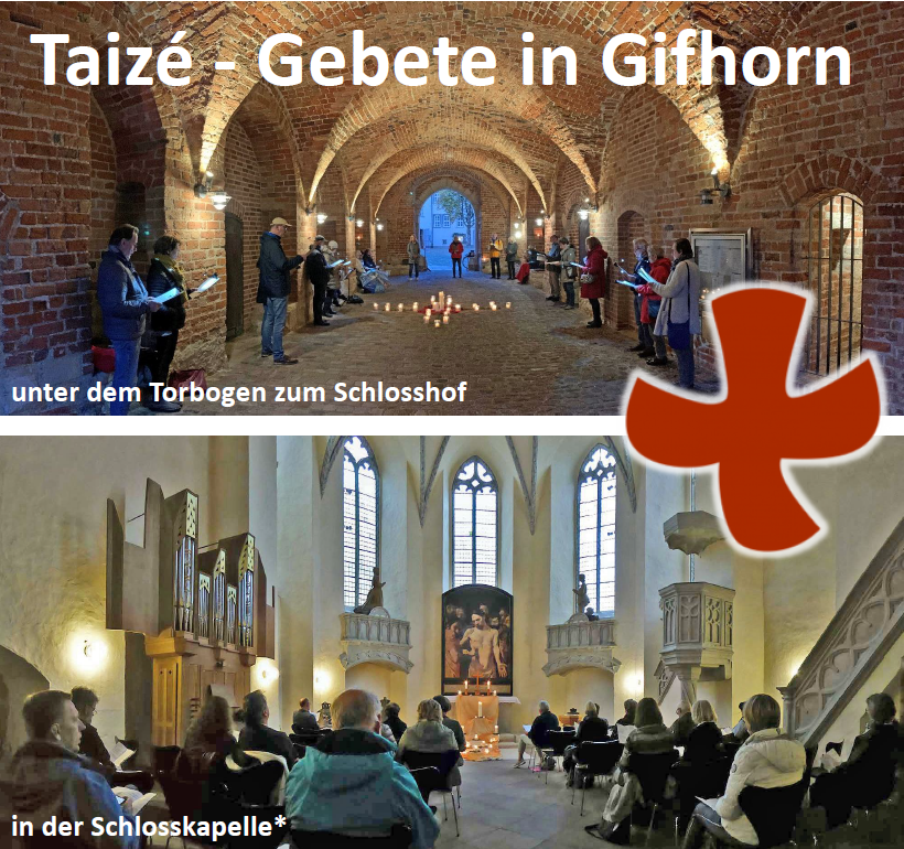 Am 12.01.26 von 18.15-18.45 Uhr findet wieder das ökumenische Taizé-Gebet in der Schlosskapelle statt. Mit Stille und Besinnung durch die dunkle Jahreszeit und in die neue Woche. Im Sitzen oder Stehen; als Angebot: Leselampen und Decken. Singen mit instrumentaler Begleitung.