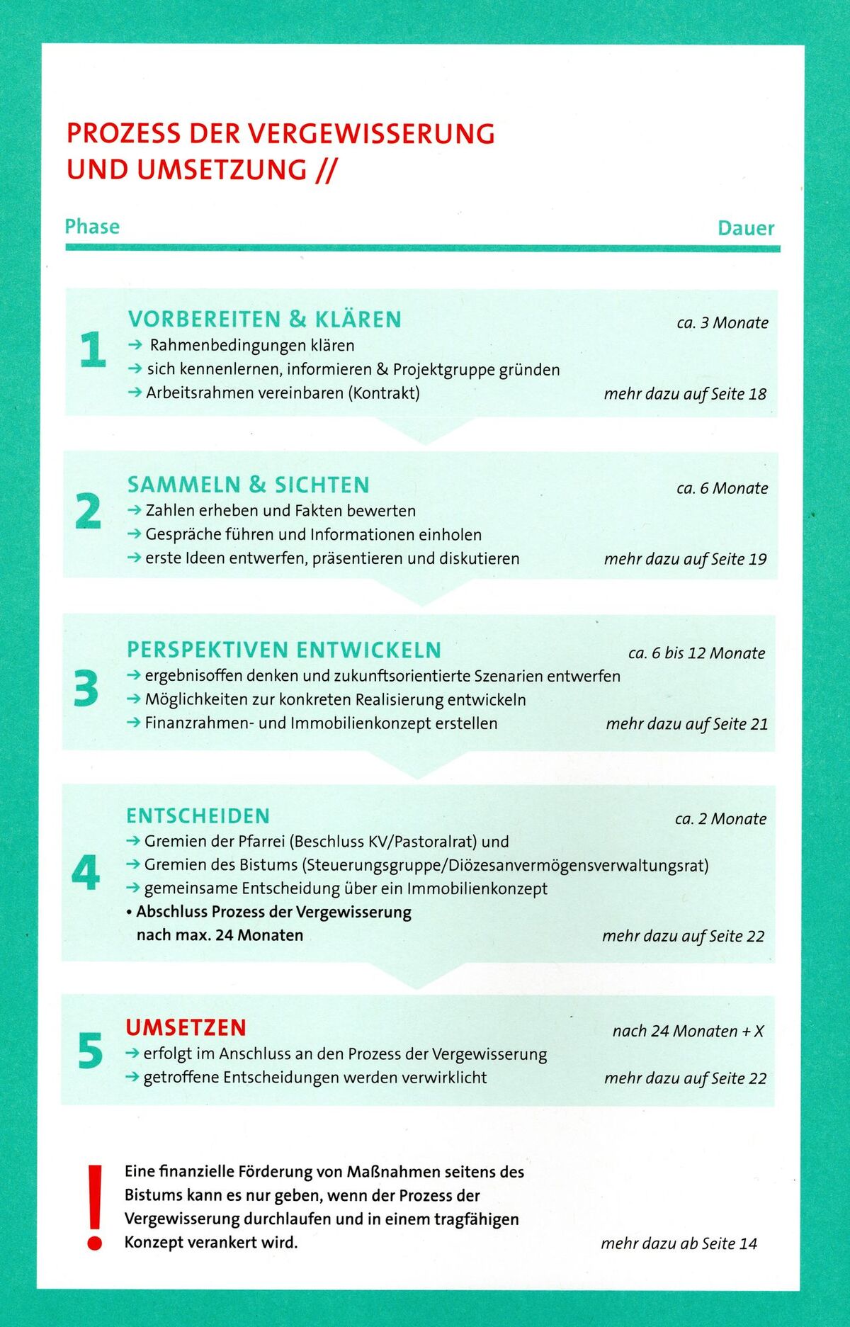 Hier sehen Sie die verschiedenen Phasen, die die Projektgruppe während des Prozesses durchlaufen wird. Die genannten Seitenzahlen beziehen sich auf die Broschüre, die Sie weiter unten als Download finden.